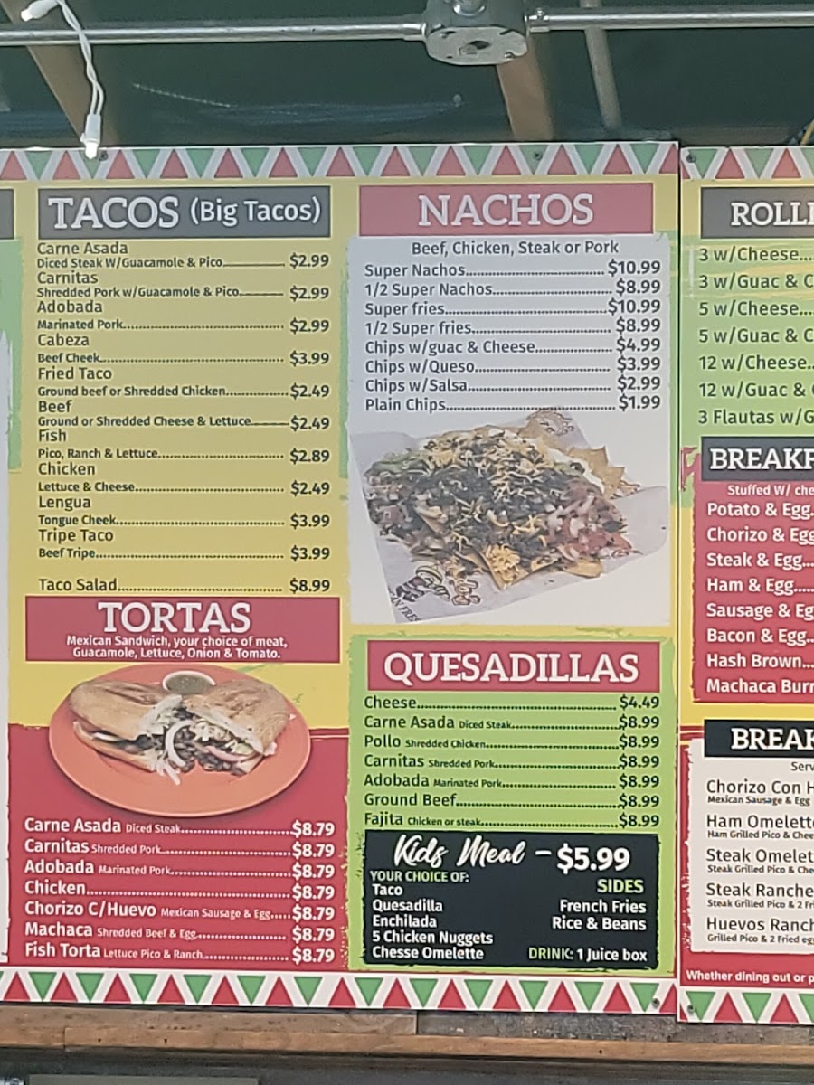 Beef. meat, cheese and beans. chicken. meat, cheese, lettuce and rice.